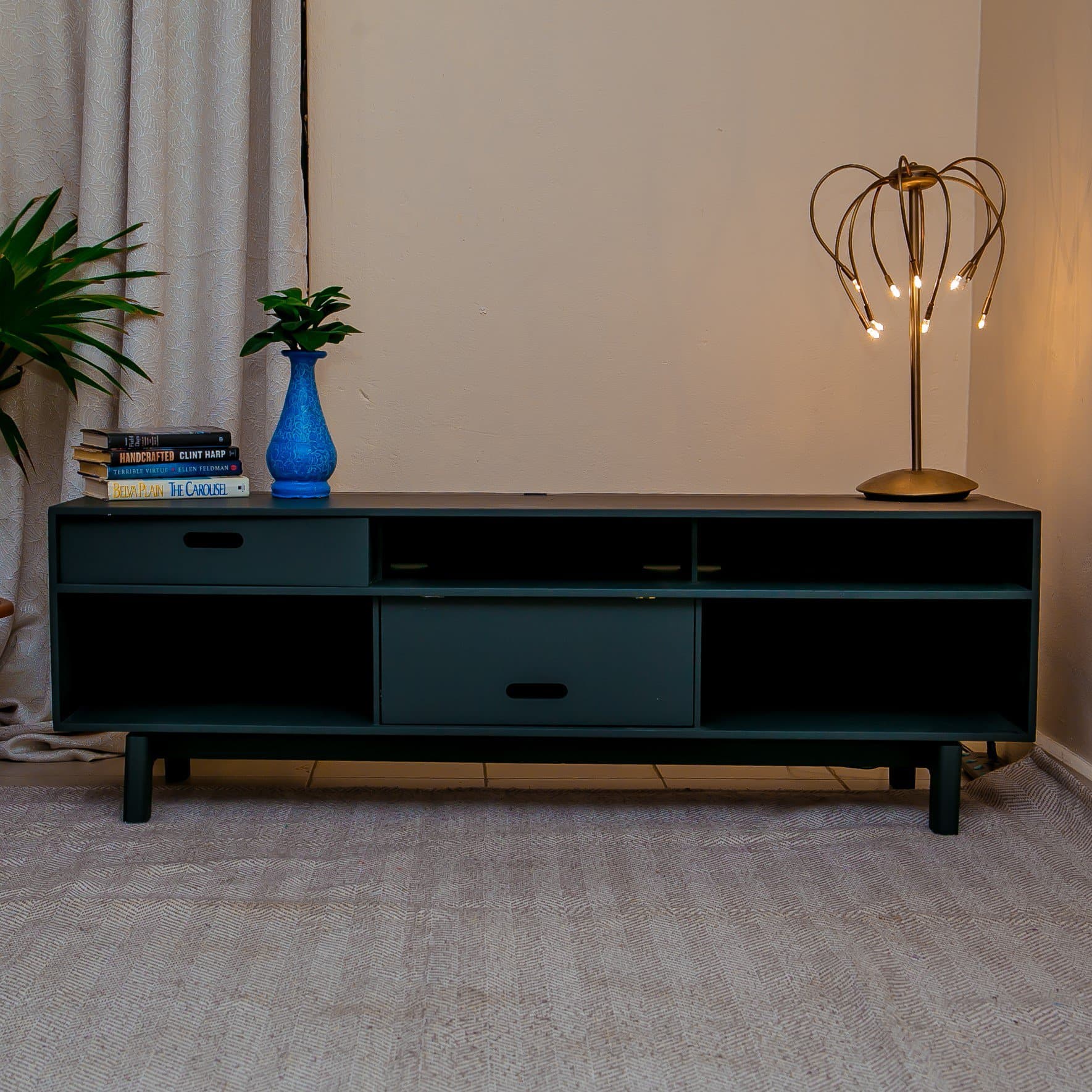 Wazi TV stand Charcoal BlackΒ  is the kind of boldness you need in life. Everything has its own cozy little space with this TV stand. The unsightly cables go to the closed spaces while the cute decor items have their open space where they can really shine.